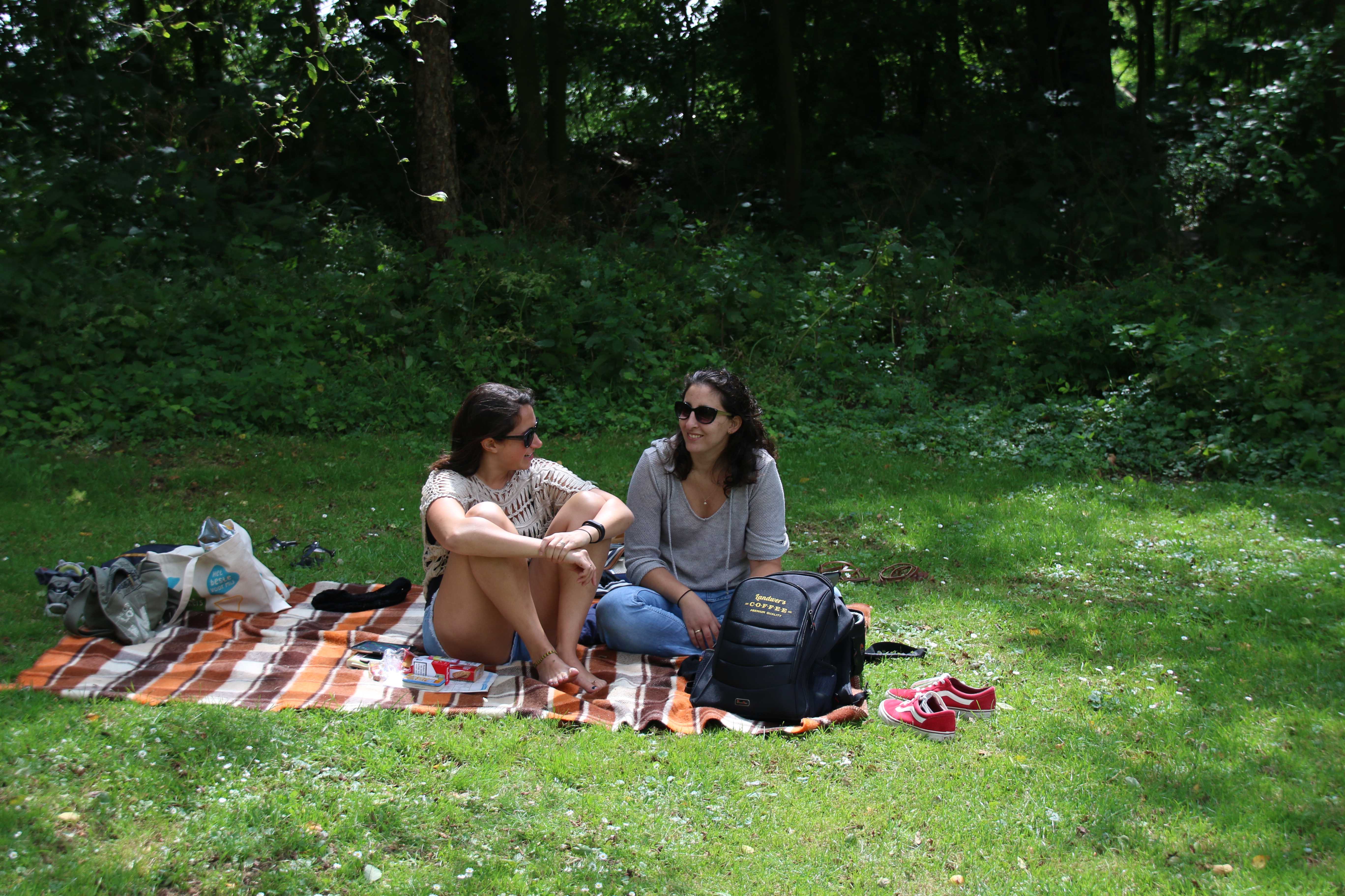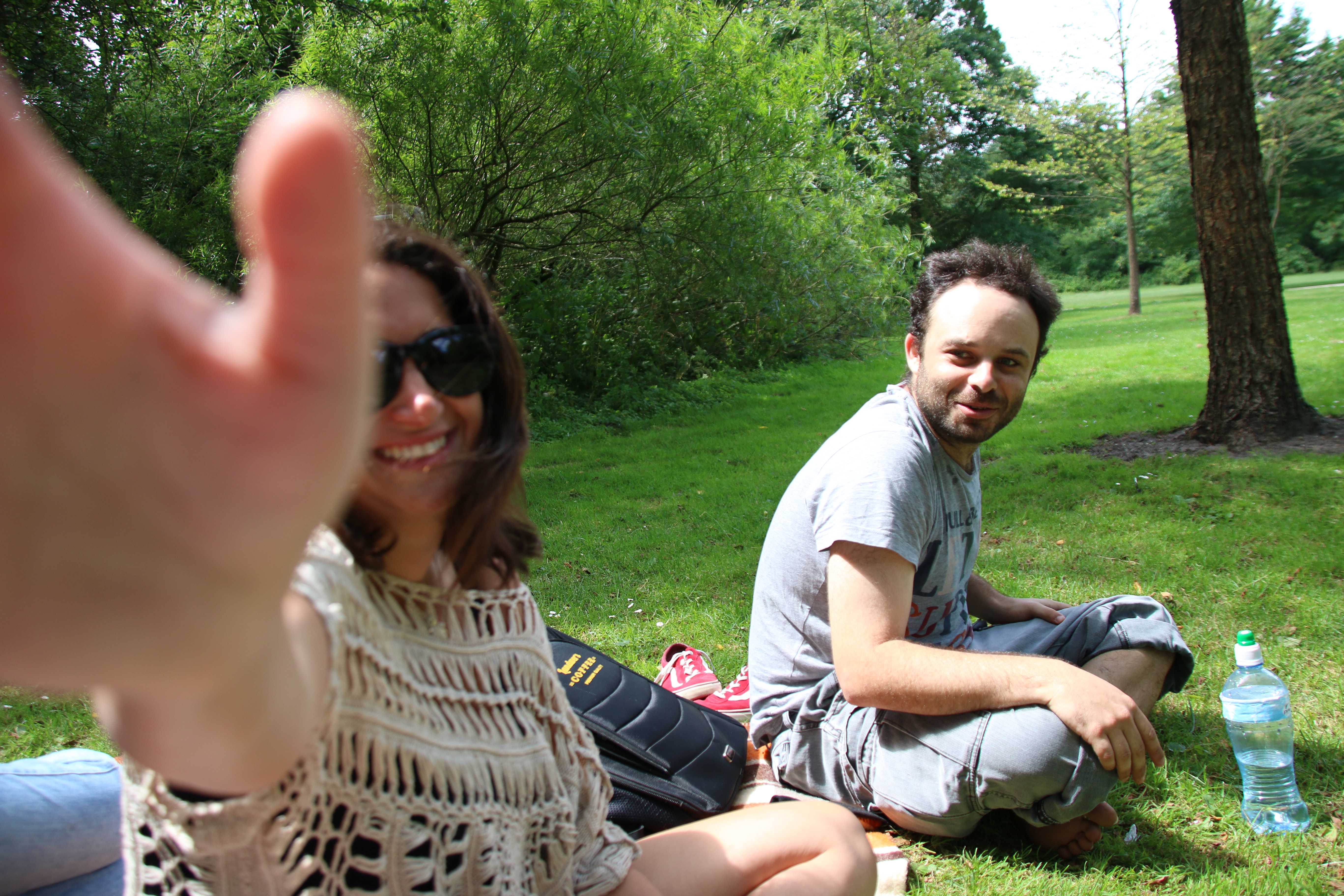 Hard at work solving crossword puzzles while picnicing at the park near our apartment: