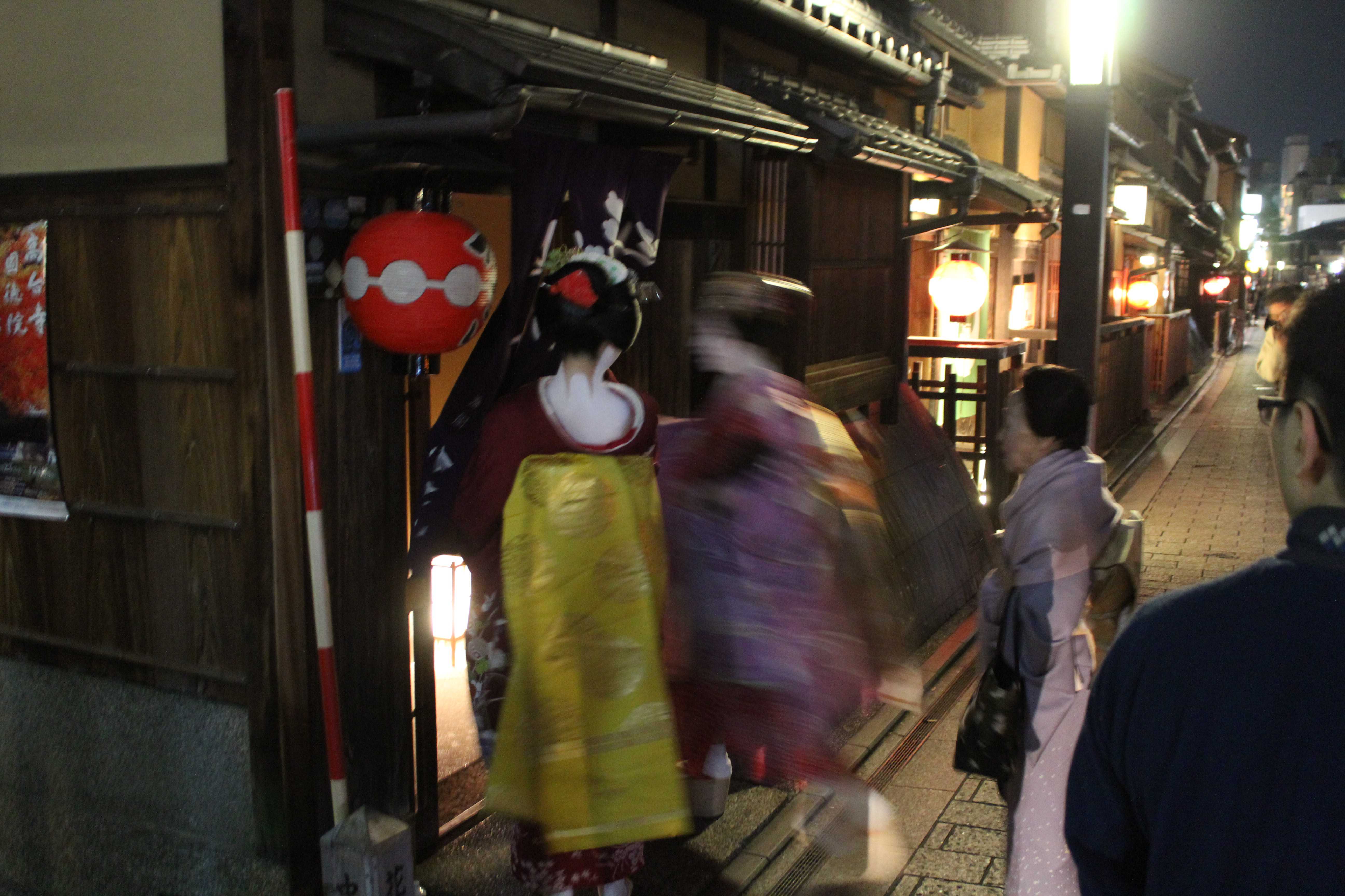 The geiko entering the tea house, with the maiko (geiko in training) holding the door open for her. Look how fast she’s moving!!
