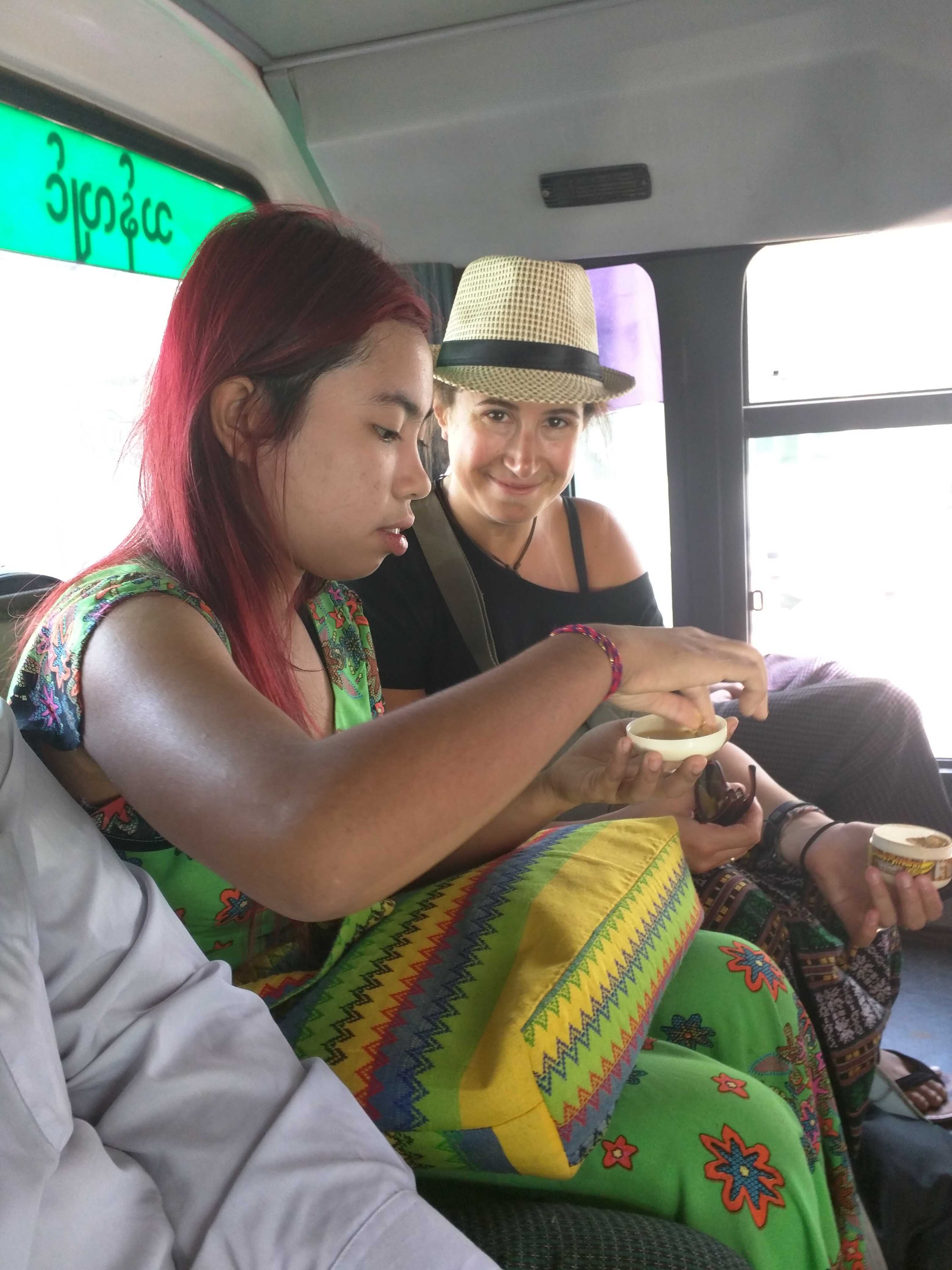 She spoiled me further by giving me a container of thanaka cream – a cosmetic paste made from ground bark that most women and all children apply to their faces for both cosmetic reasons, as it’s a fashion style, but also for health reasons, as it is said to be good for the skin (pimples, blemishes, etc) and even protect from the sun! She helped me stylishly put some on. I then returned the favor, but apparently did a terrible job.
