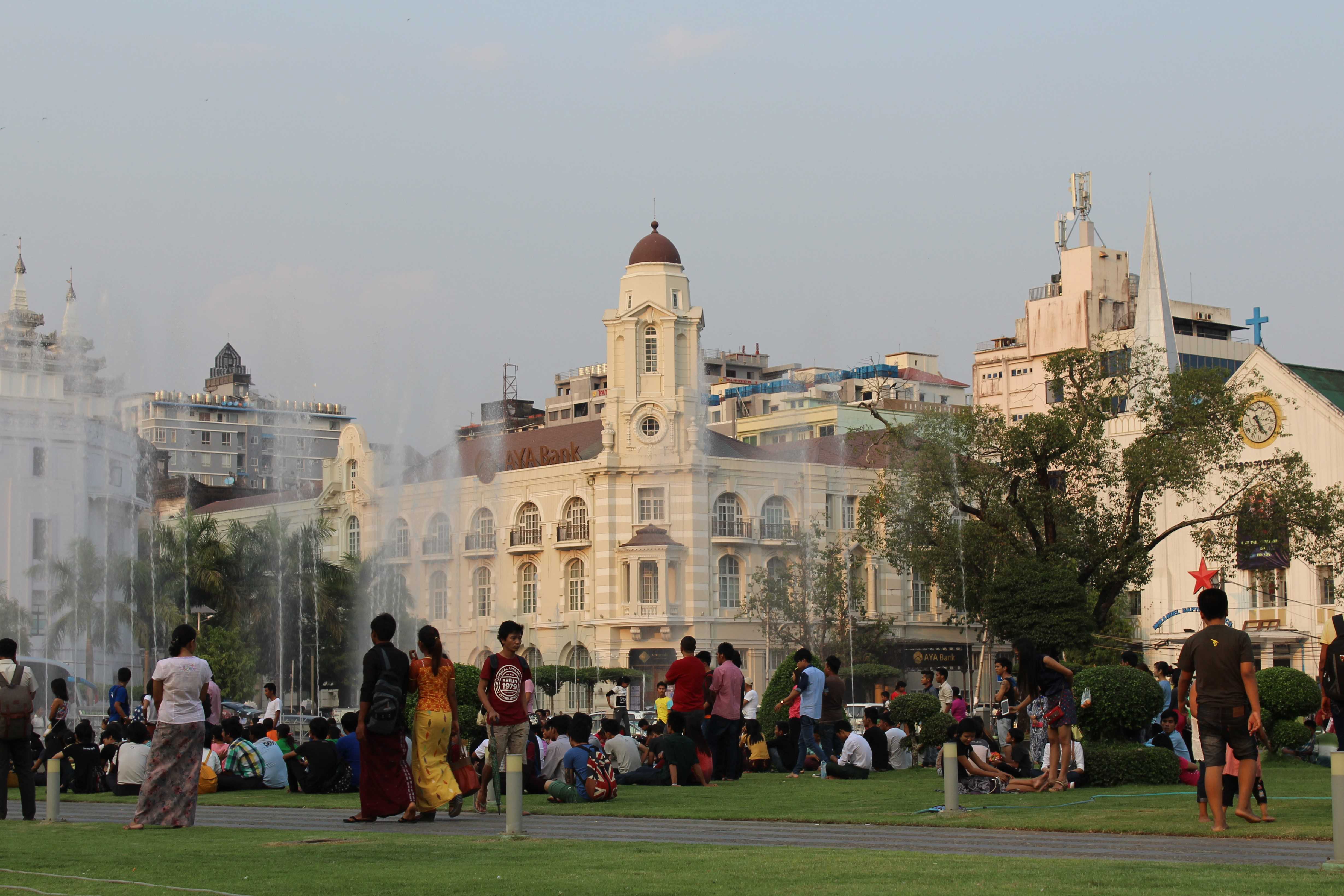 And various other government and financial institutions to the north, west and south. We walked around the park, noticing a huge crowd gathered by the northern fountain. Apparently, a very famous Burmese rock band was playing and the audience was going wild: